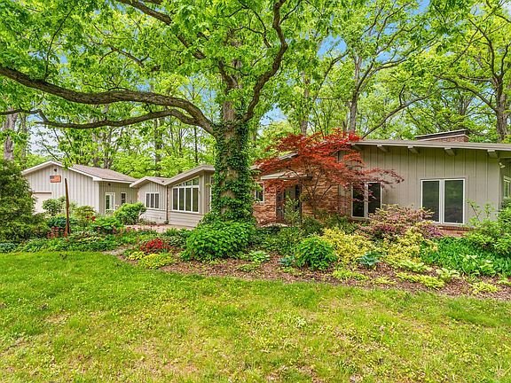 EXPERIENCE THE BEAUTY OF NATURE! This stunning mid-century modern home is nestled on 1.90 acres of professionally designed "four seasons" gardens, pond views, and untouched woodlands, offering an extraordinary oasis of tranquility. Escape the chaos of everyday life and immerse yourself in a serene retreat that invites relaxation and inspiration. Don't miss the chance to embrace this remarkable sanctuary! The open-concept main level features a tiled floor entry and pegged wood floors in the vaulted living room with a beamed ceiling. The compact kitchen is designed for efficiency, while the dining room showcases a glass ceiling, a brick accent wall, and two walls of glass windows. The third bedroom includes three lit closets, insulated walls with wall heating, and a 3/4 bath just around the corner. The main floor also boasts a laundry room next to the pantry. Upstairs, you'll find the Primary Bedroom ensuite with two closets, a barn door, tiled flooring, a soaking tub, a separate shower, and a private commode room. The lower level was previously used as an office and features a wood-burning stove, tiled flooring, and a floor-to-ceiling desk divider with electricity. The third bedroom includes its private full bath. The three-season room overlooks the native woods and a fenced garden with a stone water feature. The unfinished basement is equipped with a 2020 HVAC and AC system, as well as a 2021 water heater. The detached heated garage, built in 2018, features 6-inch insulated walls with a proper foundation and footing. Additionally, a rear screened-in gazebo on a concrete foundation with footing and a metal roof has a POND VIEW and an attached shed in the back. A new rubber roof was installed in 2018 on the house.