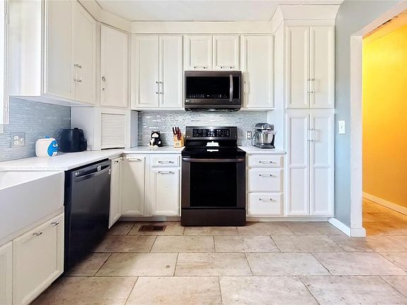 Farm sinkStainless steel appliancesQuartz countertopsCovered patioBeautiful kitchenLarge backyardWood laminate floors