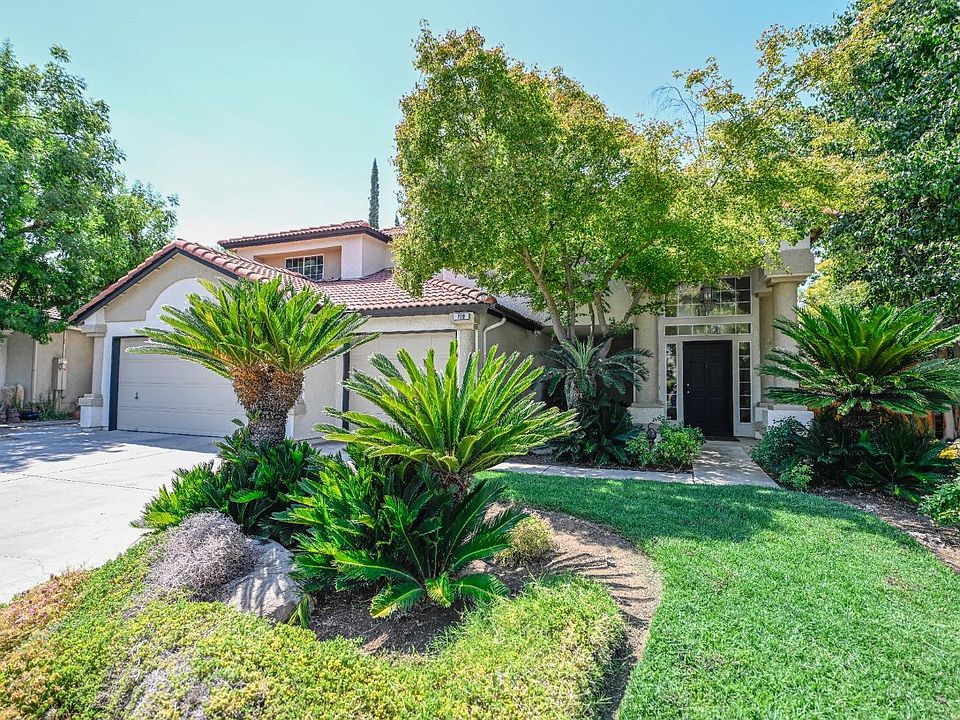 What a rare find! RECENT UPDATES include crisp white interior paint, beautiful light fixtures throughout, new sinks & faucets in all baths and laminate flooring in the kitchen, laundry room and baths. Situated on an oversized lot, this home is perfectly located within close proximity to the BEST OF CLOVIS: Schools, Miles of trails, Community parks, Shopping and Dining, with easy access to the 168 Freeway. The beautiful Mediterranean exterior greets you and leads you into an open, spacious floorplan that is the ideal landing spot for friends and family. Formal living and family rooms with a beautiful dual sided fireplace are adjacent to the dining room and each has a great view of the yard. The kitchen includes new laminate flooring, oven range & hood, and a nice eating area. The laundry room and a half bath complete the main level. Upstairs you will find the primary suite with a walk-in closet, bath with soaking tub and private patio overlooking the sparkling pool and lush landscape. Three additional bedrooms and a full bath are also situated upstairs. The showstopper is the back yard with a huge pool featuring a rock waterfall, gorgeous mature trees offering shade on sunny days, a vegetable garden and Navel orange, tangerine & persimmon trees. The perfect spot for enjoying the outdoors year-round, this yard is a must see. Call today to set up your private showing.