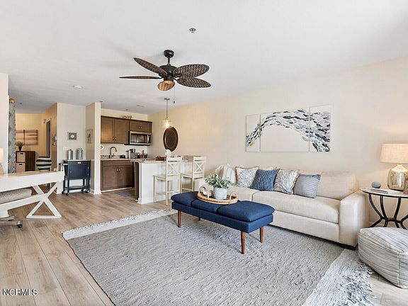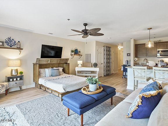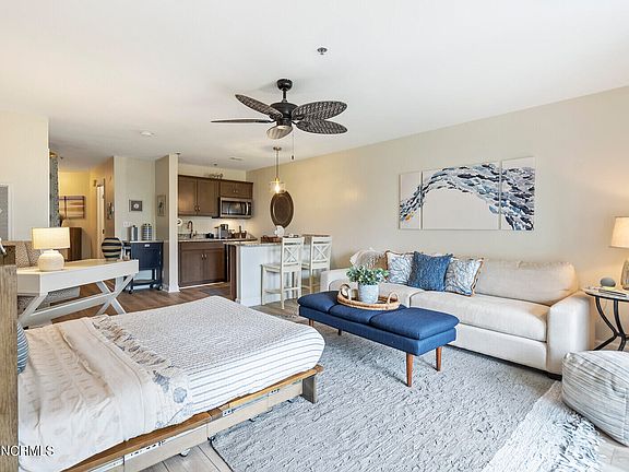 Your chance to own the best priced condo at the Villa Capriani luxury oceanfront community, where each condo is privately owned, and owner pets are allowed! This one bedroom condo is conveniently located near the on site restaurant and bar, on the lowest level, right around the corner from the elevator. Tastefully decorated, renovated in the past year, & fully furnished, it would make an excellent vacation rental, investment property, or home away from home. Smooth ceilings, new fixtures, remodeled bathroom, and new furniture means you just stock the owners closet with the good linens and you're ready to enjoy coastal NC salt life. The modern queen murphy bed easily stores for entertaining and extra room by day, and a soft comfy spot to crash after the sun sets. A workspace with a tropical view really helps increase productivity, or so we heard. The private covered balcony is outfitted with teak furniture that should last a lifetime, and it overlooks the greenspace of the internal courtyard with palm trees and a salt breeze. The efficiency kitchen has everything you need for a stress free stay, microwave, sink, and mini fridge with freezer... who wants to cook on vacation anyway?! Just grab something from Splash by the Sea, the Villa's on site restaurant, they have an amazing menu and are open for lunch and dinner, closing by 9 on weekdays and 10 on weekends. Get your dose of Vitamin Sea with a walk on the pristine beaches of Topsail Island, take a dip in one of the 3 swimming pools, soak those achy muscles in one of two hot tubs, or work on your tennis game. HOA dues for this condo are $317.57/month, there are no rental restrictions, and the separate insurance assessment for the flood insurance was $5160.49 for 2022. This one of a kind condo is sure to impress, so set up an appointment to see it with a Realtor today!