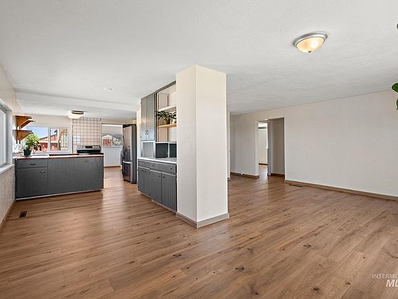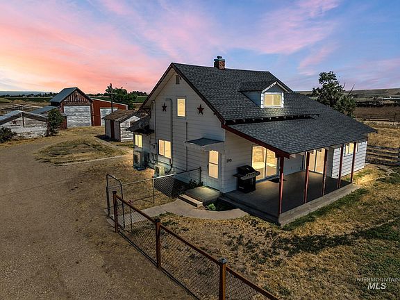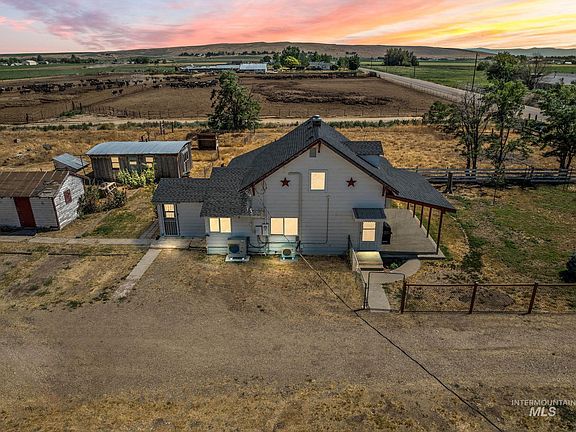 Homesteaders Delight! Situated on 5 acres this property offers endless possibilities for those with a vision for restoration and country living. New interior paint and LVP flooring (2024) on the main level and updated light fixtures throughout. Flex space upstairs would make an ideal office or hobby room. Second large room upstairs is great for storage! Outside you'll find a large barn that has been utilized as a shop w/power, and features 2 rollup doors, hay storage, and concrete floors. Outbuilding across driveway is insulated, has a heater and electricity, finished interior and laminate floor installed in 2022. Other outbuildings are great for additional storage or workspace. Bring your horses, cows, goats and chickens, property has enough concrete feed bunks to feed 50 head. New HVAC in 2023, new roof in 2021. Water is accessible and irrigation available, 4.88 acres of water rights. Refrigerator, washer & dryer, and automatic front gate are included.