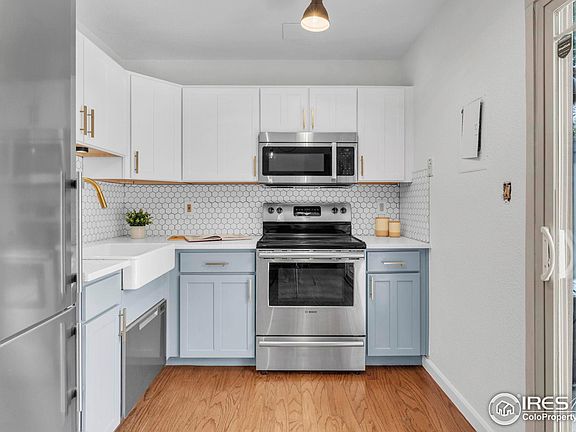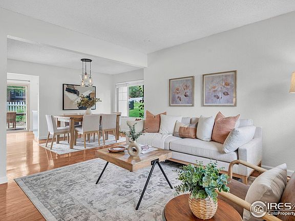 Welcome to this bright and thoughtfully remodeled end-unit townhome with 2 garages. This light and bright, freshly painted home has wood flooring and an expanded and remodeled kitchen which features high-end appliances from Liebherr, Bosch, and Fisher-Paykel. The kitchen opens seamlessly through a glass slider to a private fenced yard with a patio that backs to a spacious shared greenbelt. Sunny dining room, living room, and laundry/powder room on the main level. Upstairs, enjoy all-wood floors and three sunny bedrooms, including a primary suite with a private balcony and walk-in closet. The two secondary bedrooms offer oversized closets with abundant storage, as well as a full bath. The upper-level provides stunning views of the Flatirons! Two private garages (#86 & 87) provide storage for your bikes or gear and a level 2 EV charger, plus there is an additional reserved parking space directly in front of the unit. Fantastic HOA amenities including pool, clubhouse, and a very well-equipped gym. This lovely home is located just a two-minute stroll to Tantra Park, and within a ten-minute walk or quick bike ride to Table Mesa Shopping Center. You'll enjoy close proximity to trails, restaurants, grocery stores, and more! Easy access to Hwy 36, nearby bus stops and the Table Mesa Park-n-Ride makes commuting a breeze. This is Boulder living at its best.