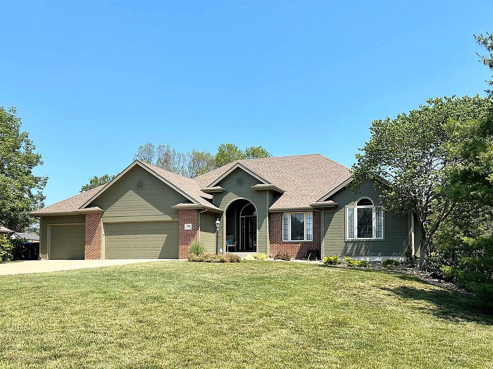 This address is a testament to the beauty and warmth of Midwest living -- situated at edge of vibrant Sherwood Park on nearly an acre with manicured lawn, sprinkler system, view of neighboring lake from long drive and extra parking pad! Brick/frame rancher with inviting front porch, custom features include transom windows, 10’ ceilings main floor (including tray, step-up tray and vaulted), crown moulding, 3/4" multi-width solid hardwood flooring (oak), 9’ ceiling in basement, expanded covered deck, fenced back yard. Entertaining is a breeze with separate Formal Dining Room w/convenient access from Kitchen and Living Room. Culinary enthusiasts will enjoy the Kitchen with Informal Dining and Center Island for easy meal preparation/doubles as a gathering place for casual conversations over breakfast or snacks. Primary Suite is spacious and offers walk-in closet and en-suite bathroom complete with whirlpool tub, separate shower and porcelain tile flooring. Laundry is located main floor (separate room) with pre-wash sink. Basement is an ideal retreat for teens and guests with Family Room, 4th Bedroom, 3rd full Bath, Bonus Room and plentiful unfinished area for storage. Sellers indicate closing/possession on or before July 31 is ideal