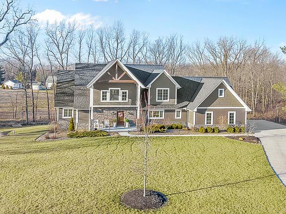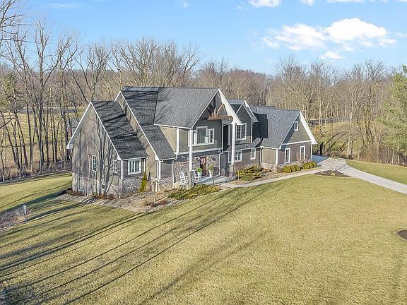Nestled on almost 5 acres in prestigious Emerald Woods, low traffic community of custom built luxury homes. 4 bedroom 3.5 Ba executive Amish built w/ expansive areas, sun-drenched rooms & spectacular vistas. Luxury living at its best, 30' soaring ceiling great room w/walls of windows & floor to ceiling stone fireplace w/reclaimed wood mantel, gleaming hardwood floors, opens to Amish built ''furniture style'' kitchen cabinets w/ pull out shelves, butler pantry. Stainless appliances inc 5 burner gas stove & more. 1st flr luxury primary suite w/ spa type shower, free standing soaking tub & walk in closet w/ organizers. Finished LL walkout has granite kitchen, bedroom w/ egress, full bath w/top of the line steam shower. Custom paver patio, composite covered deck. 3 car garage + pole shed