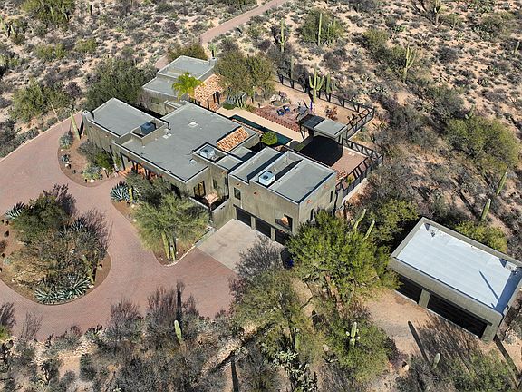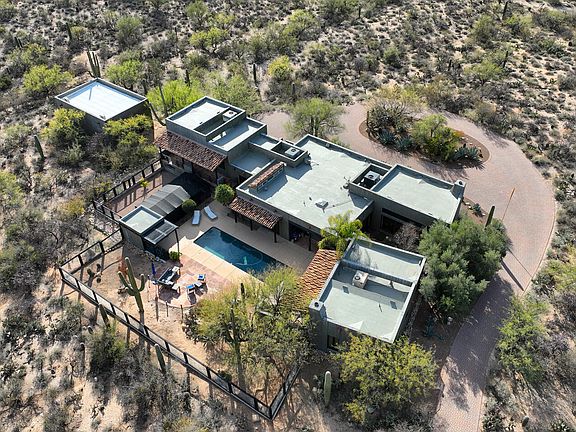 Situated in the private enclave of Cobo Catalina Hills on a secluded parcel just west of Pima Canyon. Enjoy privacy as you blend into the desert surroundings on this lush scenic 5 acre parcel. Designed by architect Abbott Harle as his personal residence offering an easiness and friendly ambiance, views surround you at every turn with large picture windows capturing mountain views and city lights beyond. Separate guest house flanks the pool area, with a series of elevated french doors spilling out onto the grounds. This home features 4 bedrooms, and 3 baths, wine room, bedroom balconies a stunning kitchen. One of a few with A 6 CAR GARAGE, Totem Pole does not convey. Pls note 5 steps up to master bedroom.