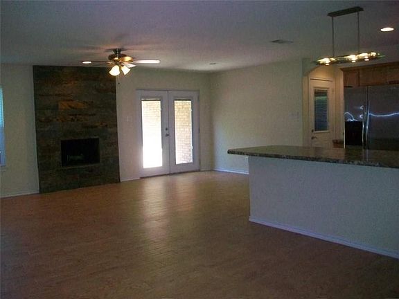 Completely redone inside from sheetrock in. Sprayed-in foam in attic for exceptional energy savings. Great detail taken in completing the kitchen & bath areas. New carpet in BRs & wood-look ceramic in living areas, kitchen & baths. Kitchen has long eating bar. Side entry to back driveway off cul-de-sac. Nice front porch looking out onto Ravenswood. Don't let front of house fool you. It is beautifully redone inside. Kitchen, dining, living all open. Beautiful stone faced fireplace at end of LR. French doors to outside patio in back. Very large corner lot next to seasonal creek for privacy.