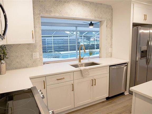 WOW.....PRICE REDUCTION AND EXTERIOR UPDATE! New cabana curtains just installed around the entire perimeter of the lanai for optional 100% privacy. Take a look at this completely remodeled 3/2 home open concept with a pool in Palm Aire. The home features a very large great room combination with kitchen. The home also has a large living room in the back. Kitchen has been remodeled with quartz counters and marble back splash,new cabinets, plumbing, lights and fixtures and all new appliances. The master suite is large enough for a king size bed and the master bathroom has new double sinks, with a new walk-in shower with a walk-in closet. On the other side of the house is the 2 guest-rooms. Both guest-rooms have new lighting and flooring. The guest bathroom has new tile, new vanity and re-done shower-tub. Guest room 2 is positioned to be separate from the house with separating door and entrance. 2 Car garage is equipped with plenty of space and a separate entrance for a golf cart. Looking out to the porch is about 300 or more square feet of entertainment space for picnics, pool parties and social gatherings. This space is gigantic and is a rare find. Not to be outdone by the pool which has both shallow and deep ends. Walking steps allow for all different ages to enjoy the pool. The home is quite large at over 2200 square feet. Palm Aire is known for its views of wildlife, walking and golf course views. Manatee County Conservatory Park is only a short walk down the street.