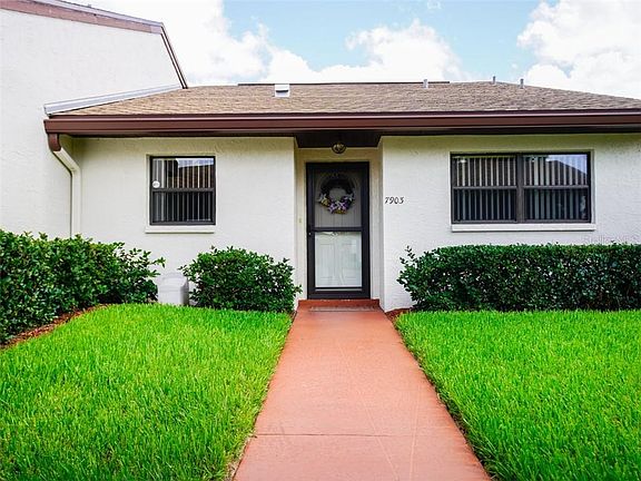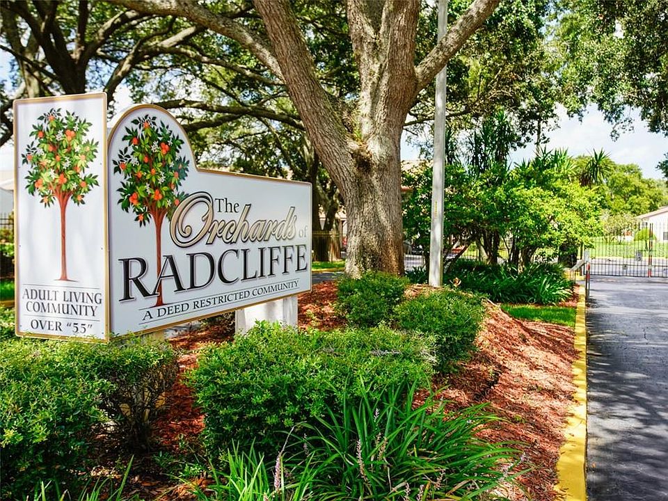 Wonderful 2 bedroom, 2 bathroom Villa on a single floor. Located in the 55+ gated community of The Orchards of Radcliffe. Very well cared for and boasts walk in closest in both bedrooms. Florida Room is included in the living sq ft as it is also has heat and A/C. This villa has covered parking along with an attached shed in parking area. Maintenance fee includes gated community, outside maintenance i.e. painting outside, insurance, cable and internet, water, sewer, trash, roof, pest control, clubhouse with pool and spa. Electric roll down hurricane shutters and features an inside laundry room with updated washer and dryer. Appliances also include updated Refrigerator and stove, newer Microwave, and Water Softener. Newly painted inside, recent flooring in kitchen, A/C is 4yrs old, Roof is 1 yr old, updated kitchen sink and faucet, newer bathroom sinks and newer back patio area with beautiful Florida Friendly plants and greenery. Home features an owned alarm system, which has optional monitoring. Close to wonderful dining, shopping, and entertainment. Centrally located to the beaches, shopping, Suncoast Parkway and interstates.