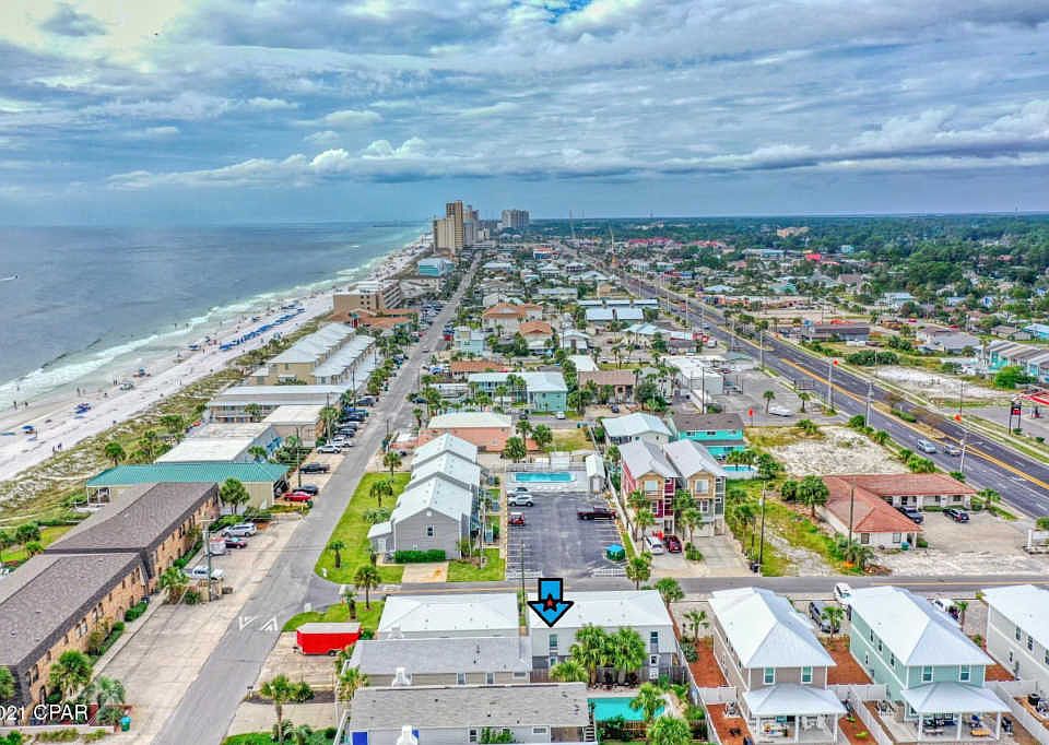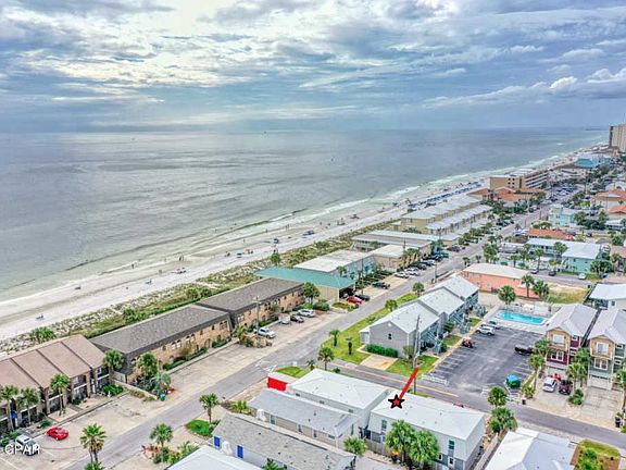 Check out this hidden gem! Located south of Thomas Dr. just steps to the sugary white sand! Imagine pulling right up to your door with no elevators to wait on and with 2 parking spaces you will never have to fuss with fighting for a parking spot! This is a small community of only 20 units. This unit offers a PRIVATE/Keyed beach access and community pool just steps from your front door! This townhome is being sold fully furnished to include the beach cart, storage box, and all the beach toys! The roof, siding, windows and A/C were all replaced post Hurricane Michael. With rental projections of $25,000-$30,000 per year and low HOA fees of only $337.00 per month this is a great investment!
