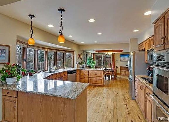 This stunning home is truly OPEN with a Huge Great Room, beautiful wire brushed hickory floors on the main level, Vaulted Ceilings and Skylights with awesome natural light shining through multiple windows with access to covered deck to enjoy those Colorado evenings on the eastside of the house. Easy visibility of Dining Room, Large Kitchen and Eating Area all overlooking a gorgeous backyard. The kitchen has been updated and the home is situated on a hill giving privacy and feeling of space in addition to the large lot. Master Bedroom has floor to ceiling windows w/awning & updated 5 piece Master bath. 3 large bedrooms and bath up. The backyard is spectacular with stamped concrete, custom brick planter boxes, a fabulous Pool with a water feature coming from the Hot Tub, a privacy wall and professionally landscaped. Truly a backyard to share with family and friends. Basement is an open floor plan, fireplace, wine cellar, 2 addl bedrooms, bath w/steam room and a private entrance