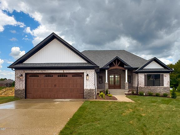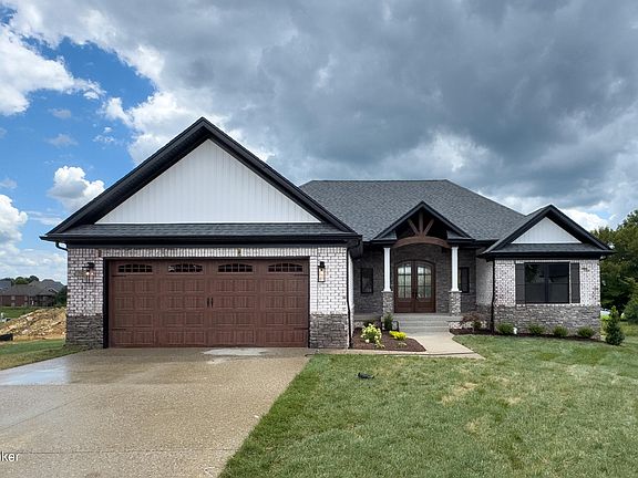 This brick and stone ranch with a finished lower level sits on a quiet cul-de-sac, offering both style and privacy. Arched wood and leaded-glass entry doors set the tone for a warm welcome. Inside, the open floor plan with LVP flooring offers both durability and style, while a gas fireplace with a tile surround and natural wood mantle creates a cozy focal point. Built-in bookcases provide charm and practical storage, and the coffered ceiling with ceiling fan adds an upscale touch. The kitchen is designed for both beauty and function, featuring white cabinetry, stainless steel GE appliances, and stone countertops. The large breakfast island, finished in contrasting gray with panel trim and a farmhouse sink, is perfect for casual meals or conversation while cooking. A walk-in pantry with a window keeps essentials neatly tucked away, and the decorative shelving and gray range hood give the space a custom look. The primary suite is a true retreat, with a two-tiered vaulted ceiling and beam finishers adding architectural interest. The sliding barn door opens to a spa-like ensuite, complete with a double vanity, full-size step-in shower with accented tile and a bench seat, and a freestanding soaking tub for relaxation. The large walk-in closet connects directly to the laundry room making chores quicker and easier and even includes a rinse sink. A split floor plan offers privacy for the two additional bedrooms and full bath, while a powder room and drop zone off the garage make daily life more organized. The partially finished basement expands your living space with a family room and dining area ideal for game nights or gatherings plus a bar/kitchen combo with dark wood cabinetry, white stone countertops, and subway tile backsplash. An additional bedroom and full bath make it a comfortable guest suite, while the unfinished spaces give you room to grow. Enjoy outdoor living on the covered wood deck with a ceiling fan for warm days, overlooking a large lot perfect for gardening, play, or future landscaping dreams. Located in Fern Creek on the east side of the Gene Snyder for an easy commute, this home offers quick access to Bardstown Road's shops and dining, The Parklands for outdoor adventures, and Taylorsville Lake for weekend getaways.