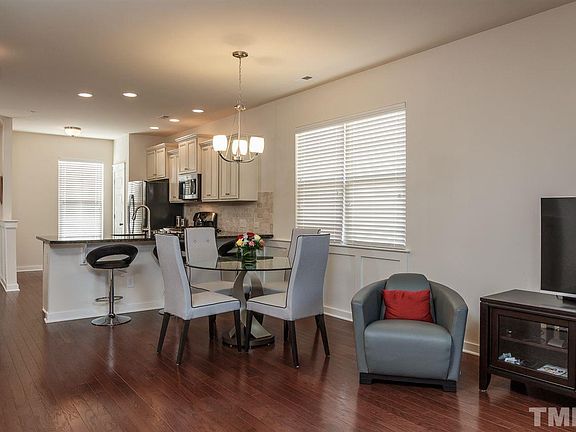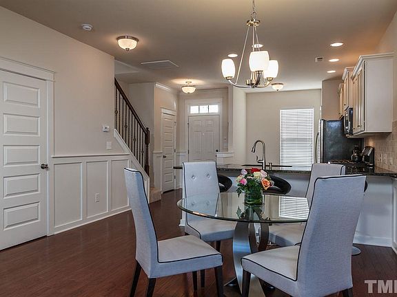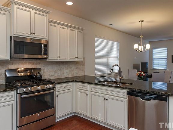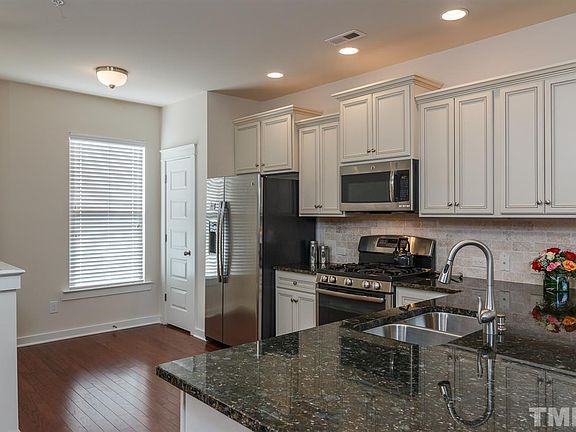 This end unit TH is only 14 mos. old, no work to be done! Tons of upgrades! Beautifully done kit w/ cream cab's w/ choc glaze, upgraded granite, tumbled stone back splash, SS appl include 5 burner gas range & fridge! Entire 1st fl HW's, ceiling fans in BR's & FR, upgraded carpet, prewired security, spray foam insulation, side windows for natural light, priv fence & patio out back with trees, washer/dryer convey. MBR is spacious w/ 12' ceiling & WIC. Superior location in NW Ral, close to everything!