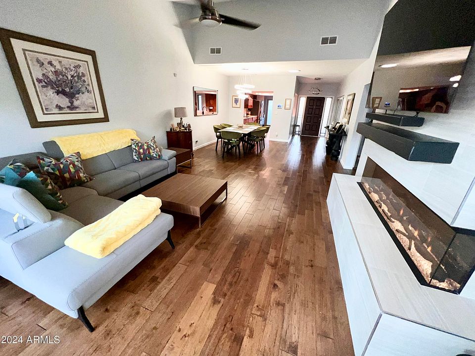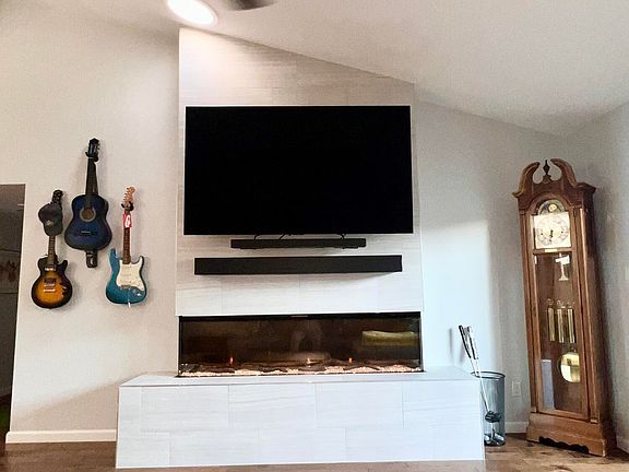 flooring throughout and carpet in the bedrooms. The attention of the living room is a custom-built, three-sided luxury electric fireplace, perfect for cozy