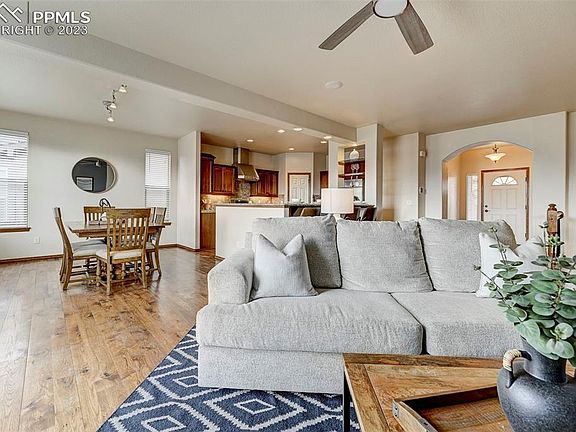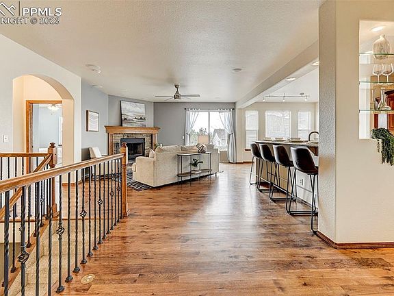 This beautiful Rancher in Cumbre Vista is move-in ready! Relax in the hot tub with unobstructed views of Pikes Peak from this corner lot gem. You'll find gorgeous hickory flooring on the main level, a home office - or guest bedroom, a full bath, main-level laundry, and a main-level primary suite. The gourmet kitchen is the focal point of the great room with a 5 burner gas range, matching overhead vent system, granite, a breakfast bar, and plenty of counter space for entertaining. The dining room is adjacent to the kitchen and has ample space for a large table for family gatherings. The oversized basement area has 9' ceilings, two bedrooms, a full bath, a beautiful wet bar with a live edge countertop, and an area perfect for a big screen TV. You don't want to miss this Cumbre Vista beauty!