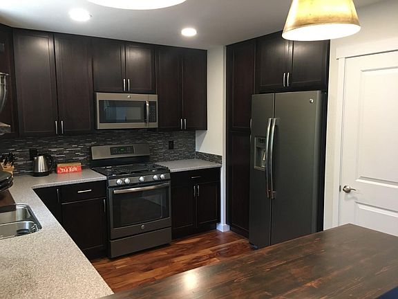 This is an immaculately remodeled 2 bedroom, 1 bath park front townhome in the coveted Belmar area of Lakewood. This townhome has been designed with upscale materials featuring a brand new kitchen with espresso kitchen cabinets, Corian countertops, new appliances and a gas stove. Stunning natural Acacia hardwood floors accent the spacious floorplan along with brand new windows, doors, and finishes throughout. 1 mile to Belmar yet a very quiet park front location with limited traffic. Renter is responsible for utilities. First month rent and deposit required to move in. Sorry, no pets. Existing couch and dinning table fit this space perfectly, they will be include if you want to use them.