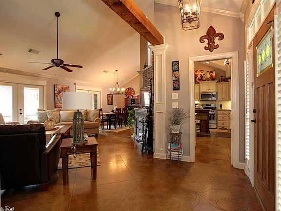 Etched Stained concrete floors throughout. French doors open into the screened in porch with ceiling fans and wood burning/gas fireplace. Cabinet above fireplace for outdoor TV. Plantation shutters in kitchen windows. Large farmhouse sink. Cathedral ceilings. Exposed brick wall and rustic beams. Over-sized walk-in master shower with rain forest shower head and two additional shower heads. Pocket door leading to kitchen. Slide out drawers in kitchen cabinets. Built-in cabinetry in master bath and bedroom.
