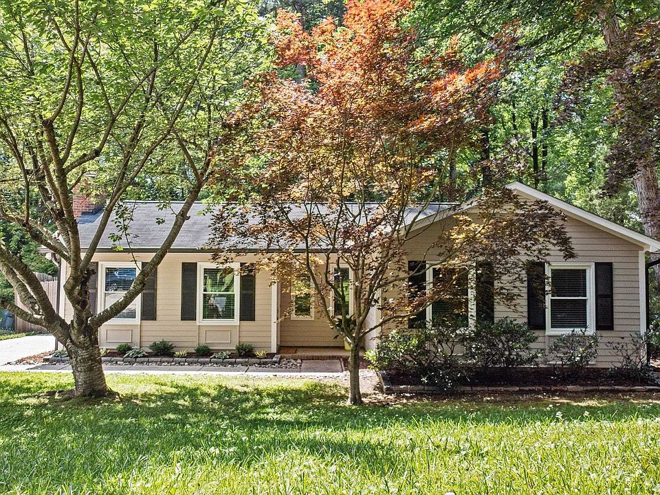 Welcome to your perfect north Raleigh jewel box home! Nestled in the heart of an established neighborhood with lush trees and a grassy yard. Just steps from several shopping/dining centers. This home features a NEW kitchen including white shaker, soft-close cabinets, quartz countertops, SS hood, SS refrigerator and a tile backsplash. NEW laminate flooring. NEW windows and sliding door. NEW lighting and fans. Exterior and deck painted 2021, water heater 2019. Washer & dryer are included. Wide open living room allows lots of natural light to fill the spaces. Ample closet storage spaces - the primary bedroom has 3 closets! The second bedroom, 2 closets. Large deck with trellis/pergola overlooks the private, fenced yard. Quick drive to I-540, North Hills, I-440. There is nothing left for you to do except fall in love and move in.