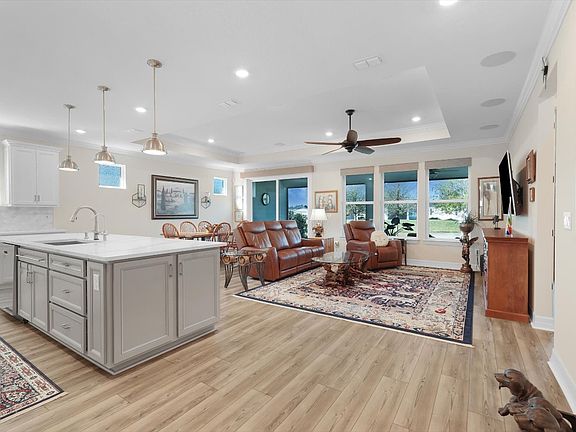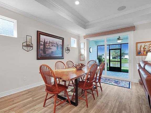 Welcome to Del Webb Wildlight community! This modern 2-bedroom, 2-bathroom home also comes with a glass-enclosed office, which can act as a flex room or be converted to a third bedroom. Designed for active adults, it features an open floor plan connecting the living, dining, and kitchen areas, with built-in surround sound for entertainment. The gourmet kitchen boasts stainless steel appliances, quartz countertops, a granite sink, a large island with seating, soft-close cabinets with pull-out shelves, a custom pantry, and advanced features like a Delta Touch2O faucet, reverse osmosis system, and tankless water heater. Additional upgrades include crown molding, high doors, tray ceilings, an enhanced laundry room, a brick paver driveway, a screened lanai prepped for an outdoor kitchen and TV, and a serene pond view with live oak trees. The garage has epoxy flooring, attic storage, and a water softener system. Smart home features let you control shades, lighting, and temperature with ease. Other highlights include plantation shutters, LVP flooring, and gutters surrounding the home. Instant equity in this home- a rebuild of equal caliber would be thousands more! Schedule your private showing today. Seller will replace the current electric cooktop with the original 36" Whirlpool 5-burner gas model, prior to closing.