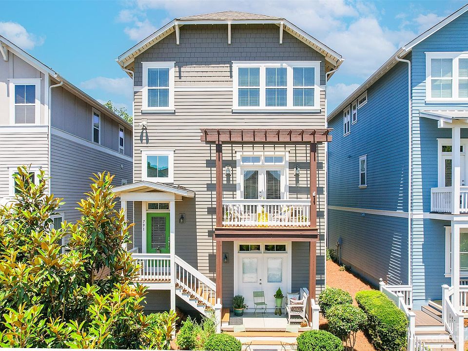 Welcome to the "tree house" with seasonal water front views and FOUR outdoor entertaining areas. Sitting high in the trees, this home beams with natural light through the front and back of the home. This Saussy Burbank built home offers beautiful hard wood floors, custom trim and built-ins throughout. Enjoy having TWO primary Ensuites, one through the ground floor entrance and one on upper floor. The main floor provides a great space for entertaining with an open floor plan, a large screened in porch off of the living room and a balcony porch off of the dining room in the front! The spacious kitchen offers granite counters, subway tile backsplash and a large breakfast bar. Upstairs there are 3 full bedrooms and 2 bathrooms. The primary ensuite has direct access to another large porch where you can enjoy the views! This home has been meticulously cared for. Enjoy Riverwalk living with new outdoor pool, river access, walking trails and SO many more amenities.