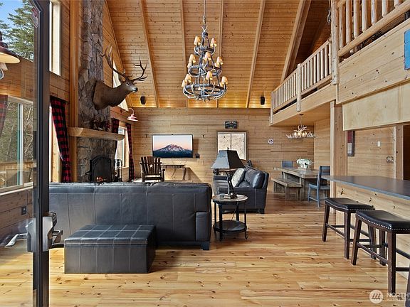 This picturesque, custom-built lodge is nestled in the evergreens above Lake Cle Elum, w/year-round access! Stunning greatroom features floor to ceiling windows & stone FP. Paneled ceilings, exposed beams, & salvaged southern heart pine floors bring warmth & cozy ambiance. Well appointed kitchen w/plenty of storage & new quartz counters. 2 bdrms + 3/4 bath on main floor. Upstairs, find 2 add'l bdrms & a full bath. The daylight bsmnt hosts the rec rm, w/extra sleeping space, access to 2 car garage and lwr deck w/hot tub. Imagine evenings on your wraparound deck, w/friends & a campfire; gazing at the lake & mountains! Access thousands of acres of snowmobile trails out your back door! VRBO ready. Near public boat launch, minutes to Suncadia.