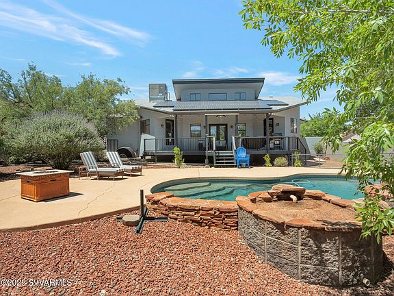 Treat yourself to tranquil living with unblockable Mingus Mountain views and a refreshing pool featuring a peaceful water feature. This well-designed 3-bed, 2-bath home offers soaring ceilings and clerestory windows in the spacious living room, creating an open and airy feel. The updated kitchen adjoins the main living space and opens to a private backyard oasis—accessed directly from the kitchen, living room, and primary suite.