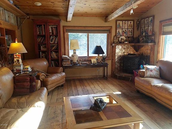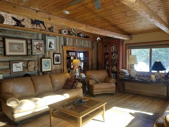 Rustic Log Home in the trees on 11.84 Acres. 1948 sf, 2 bedrm, 2 bath home with solid rough-sawn flooring throughout. Hand-crafted beams. Vaulted ceiling. Family room addition with gas stove. Spacious master with charming bathroom with jetted tub. Adorable Bunkhouse. Detached garage. Very private setting in the trees, electric gate & lots of fencing for dogs. Part of Cow Creek runs along back portion of property. Home has deferred maintenance & will not qualify for government financing due to lack of well water production.
