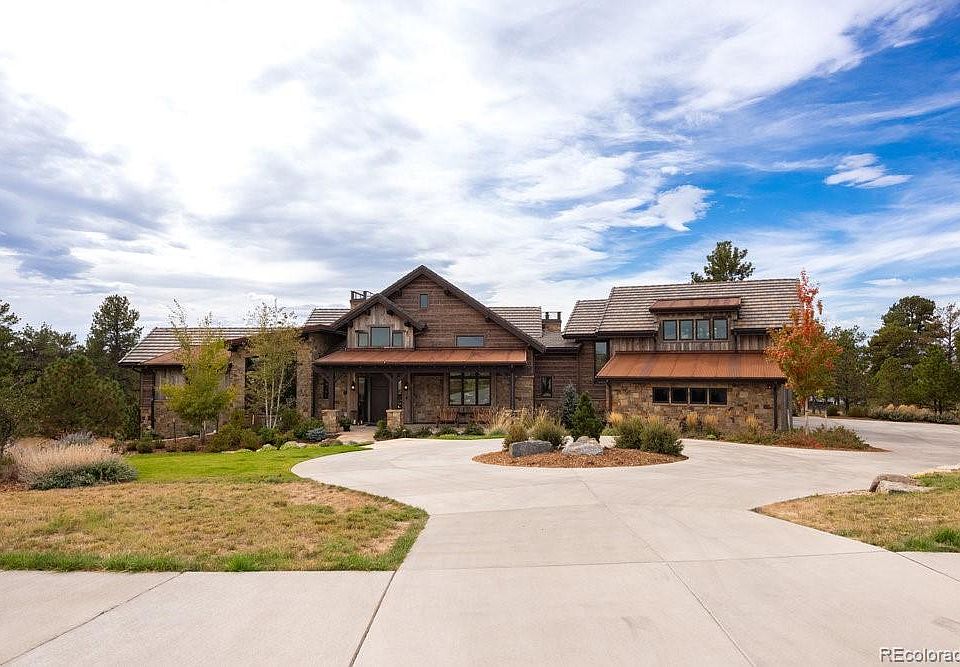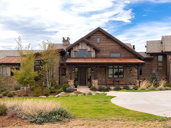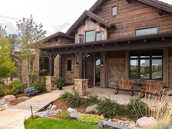 Located in the exclusive gated community at Colorado Golf Club, this custom home features a sophisticated architectural style characteristic of a modern farmhouse with a twist of rustic industrial flair. This stunning estate sits on nearly 2 acres of elevated rolling meadow with towering Ponderosa pines and distant mountain views. The incredible open concept main level has rich hardwood floors throughout, beautiful custom plantation shutters and custom blinds, and features a soaring great room with a unique free-standing stone fireplace and huge windows showcasing the captivating views. The Chef’s kitchen features top of the line stainless steel appliances with a massive center island and ample storage. The kitchen opens to the great room, dining area, hearth room, and the adjoining covered deck, creating a stunning common area for family gatherings large and small. The main floor primary retreat has a full-wall fireplace surrounded by custom built-ins, a private owner’s deck, 2 custom walk-in closets, and a 5- piece bath with every luxurious finish. A powder bath, a light-filled laundry room, a convenient mudroom, and the oversized 4-gecar garage complete the main level. A rear stairway leads to the upper guest quarters, perfect for teens, nanny, or special houseguests. The dramatic main staircase descends around the central stone fireplace and opens to the full walk-out lower level featuring a family room/rec room with billiards and gaming area, Full Swing Golf simulator, tavern-style bar and a climate-controlled wine room. There are 3 additional bedroom suites, 2nd laundry room, powder room, and plenty of storage in the lower level. The home is designed to accommodate a future elevator if desired. You will love the outdoor living space featuring mountain views, fireplace, gas grill and additional gas heaters. The lower level also features an amazing firepit. For a complete set of photos go to website http://www.7910forestkeepcircle.com