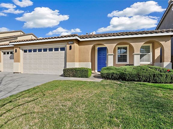 This is what you are looking for... single-story Eastvale pool home! Sitting on a large lot with views of the surrounding foothills! The interior of the home has neutral flooring with an open floorplan, recessed lighting, white blinds, and tall ceilings giving the home a bright and spacious feel. There are two full bathrooms, and a half bathroom. Formal living and dining rooms. The home boasts a large family area with a fireplace, view of the backyard pool and an adjacent big kitchen w/pantry, maple wood cabinetry, granite countertops, center island, 5 burner cooktop, under cabinet lighting, separate desk niche and a large eating area. The secondary bedrooms are generously sized with ceiling fans. The Primary Suite features a walk-in closet, private en-suite with double sinks, soaking tub and a separate shower, and has also been updated with paint and new baseboards. Bathrooms have new toilets and flooring, as well as laundry room. The laundry room has a sink and additional cabinet space. Enjoy the large backyard with a beautiful pebbletech pool and spa, stacked stone, glass tile accents and new pool equipment, and lights - all perfect for entertaining! The pool and spa has a newer heater just installed a year ago. The block wall fencing is a great feature. New water heater. Camera system installed for comfort and convenience. Beautiful fruit trees. Enjoy the comfort of very low maintenance back yard with synthetic turf grass recently installed. The garage also has mini split a/c and heater that can be utilized for a gym or pets. Solar. Conveniently located near schools, shopping, dining, and more! Low HOA only $25/mo.