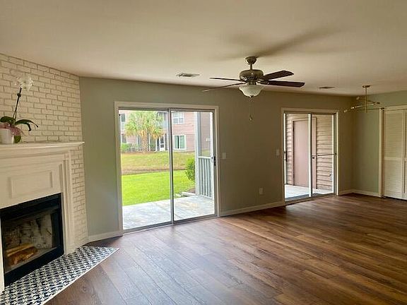 This beautifully renovated ground floor condo is turn-key and ready for a buyer that wishes to be in North Charleston near Boeing, Bosch, Charleston AFB, or Charleston International Airport. Newly renovated Bathrooms include freshly tiled floor, new vanities, toilets, and lighting. There is a wood-burning fireplace with a ceramic tiled hearth set in a mosaic pattern. Beautiful new Luxury Vinyl Plank flooring throughout is durable and ideal for pets. All new top grade interior Sherwin-Williams paint (Aloof Gray) trimmed in SW Futon provides a light and fresh feel to this condominium. The Kitchen offers Maple cabinetry, with a crisp white Subway tile backsplash. A screened-in enclosure (with extra storage) opens onto an open concrete patio, perfect for sunning and grilling.The Park at River's Edge is a gated community with superb amenities. There is a Jr. Olympic sized pool, Clubhouse, tennis/pickleball courts, RV/boat storage, playground, and ideal sidewalks within the community. Owner/Seller is Agent.