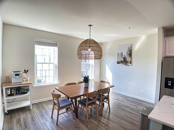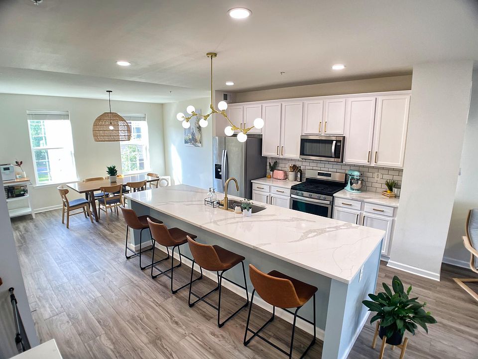 WE ARE NO LONGER ACCEPTING INQUIRIES AT THIS TIME Welcome to this one-of-a-kind coastal and mid-century modern themed townhome in Elkridge, MD. Owner had the entire place beautifully renovated with luxurious materials and has absolutely loved living in this home. Make it yours as you won't find anything like it in Howard County! The main attraction is the second floor which features a vast open floor plan living space perfect for hosting friends and family. As you walk up the stairs you experience the beauty of an oversized calacatta quartz kitchen island and counters - a chef's dream. Kitchen includes a modern tile backsplash, beautifully painted cabinets, stainless steel fridge, professional range and oven, dishwasher, built-in microwave, large pantry, and deep sink. Gold faucet and cabinet handles provide an extra-luxurious feel. A dimmable mid-century modern branch light fixture over the kitchen island, an oversized flora-rattan pendant light fixture over the dining room, and dimmable recessed lighting throughout the floor create the perfect level of brightness and beauty. Extra tall windows on both sides of the home also bring in an abundance of natural light. Luxury vinyl plank flooring cover the entire area providing a great look and easy cleanup of spills. Guest bathroom located next to extra storage closet was updated with modern fixtures and mirror. From the family room, walk out the sliding door to the sizable deck perfect for fresh air or BBQ. The third floor features three bedrooms and two bathrooms. The primary suite features an abundance of space, a walk-in closet, and en-suite bathroom. On the other side of the hallway you will find two additional bedrooms and a second bathroom. Both bathrooms have upgraded vanities with gold handles, modern light fixtures, and waterfall showerheads. The three bedrooms have also been upgraded with modern center light fixtures. Rooms and stairs are covered in carpet for comfort and safety. Included washer and dryer and linen closet are also conveniently found on the third floor. The first floor features a large multi-purpose living room and coat/storage closet that can creatively be used as a play room, office, or space for guests. Extended windows again provide a tremendous amount of natural light. This floor is also carpeted for comfort with luxury vinyl plank covering the hallway. Modern light fixtures fill the hallway with brightness. Walk out to the 2-car garage that can easily fit two cars and provide extra storage along the sides. The home sits in the beautiful Morris Place Community that includes a dog park, gazebo, BBQ and recreation area, playgrounds at a walking distance, and ample parking all around. Home is in the highly rated Howard Country school district and is close to I-95 with easy access to Baltimore and DC. A short 10 minute commute brings you to BWI Airport, Arundel Mills Shopping Center, Costco, Target, Walmart, and many good eating options. Owner is looking for tenants who are committed to taking care of the beautiful home with respect and love. Preference will be given for 2 year lease. No pets and no smoking inside the home. Tenants are responsible for all utilities. Owner pays the HOA which includes common area maintenance and snow removal. Move in date can be slightly flexible. Applicants with very good credit history are encouraged to apply. All applicants are required to submit an application via Zillow (fees may apply).