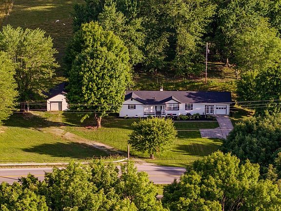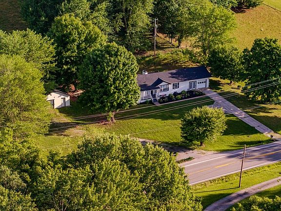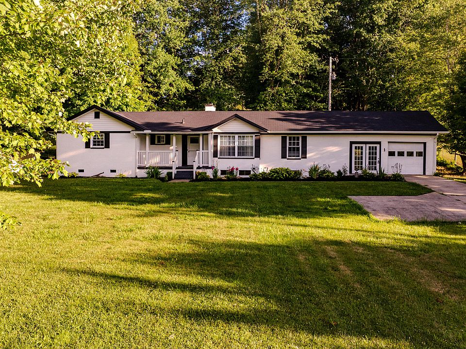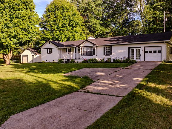 This home is a charmer, a full brick that has been modernized with painted brick and black trimmed exterior windows and doors. Newer roof and HVAC, wood style interior flooring, beautiful brick fireplace with mantle, lots of natural light through the large windows in the living and dining rooms, a large mudroom/utility room with French Doors from the driveway, a covered back patio PLUS a detached two car garage with concrete floor, electricity and a side lean to - all of this on 1.13 acres. Mature trees make a lovely canopy for the covered garage, picnic area and playset.