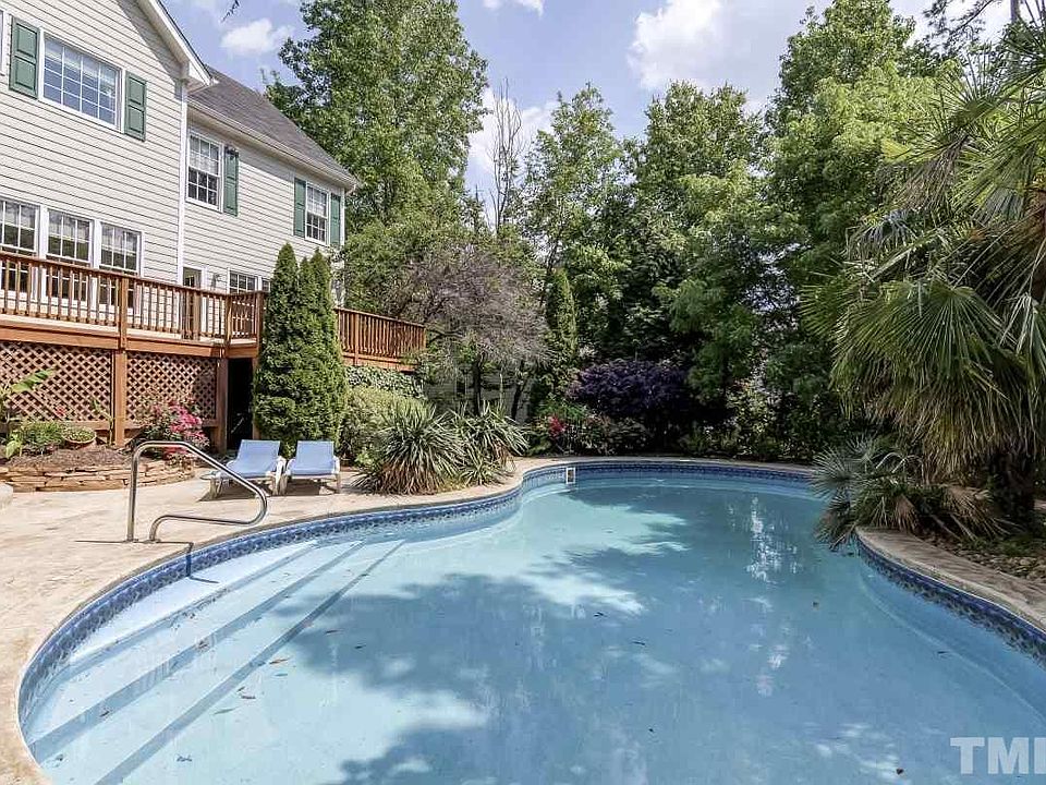 Move in ready home in prime NW Raleigh location features fantastic in ground pool surrounded by extensive landscaping. Refinished hardwoods. Fresh paint. Spacious formals. Bright & open family room w/ gas log fireplace. Eat-in kitchen includes granite counter tops. Master suite offers trey ceiling, garden tub w/ separate shower and walk in closet. Large 4th bedroom/bonus room. Oversized deck. Extra large 2 car garage. Steps to Hilburn Academy + great shopping, dining & entertainment.