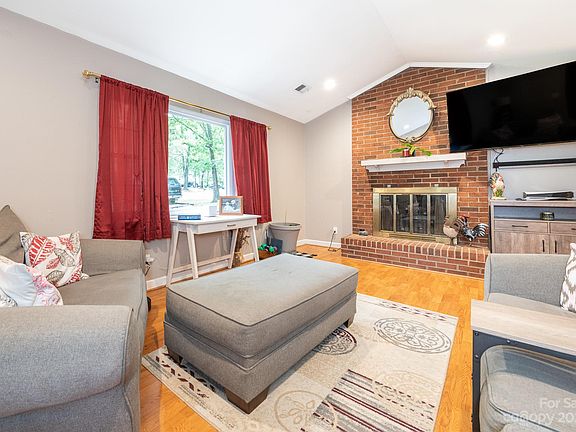 Welcome Home to this beautifully peaceful ranch style home with no HOA, located in a friendly and quiet neighborhood nearby incredible schools! Home has a fully fenced in backyard with entertainment firepit and is surrounded by mature trees creating a relaxing retreat just minutes from I-485, shops and restaurants. Enjoy the serenity from the HUGE screened-in porch with ceiling fan perfect for enjoying during any season. Inside find a bright and spacious living room with vaulted ceilings and cozy fireplace open to a formal dining room (can also be a home office space). Long spacious kitchen with bright white cabinets and breakfast nook. Primary bedroom w/ attached full bath plus 2 additional bedrooms and full hall bath. Tons of upgrades including new self-cleaning toilets, kitchen cabinets & appliances (stove & microwave) and bathroom vanity! Outside updates include 2019 roofing plus new siding and gutters!