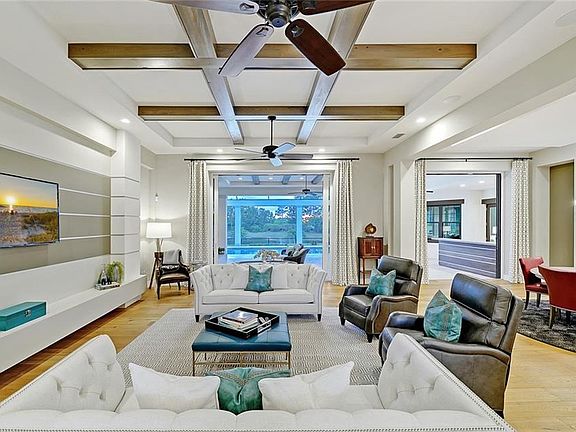 - Interior Features: Ceiling Fans(s), Eating Space In Kitchen, High Ceiling(s), Open Floorplan, Walk-In Closet(s), Solid Wood Cabinets, Thermostat, Kitchen/Family Room Combo, Living Room/Dining Room Combo, Solid Surface Counters, Window Treatments, Tray Ceiling(s), Coffered Ceiling(s)