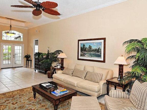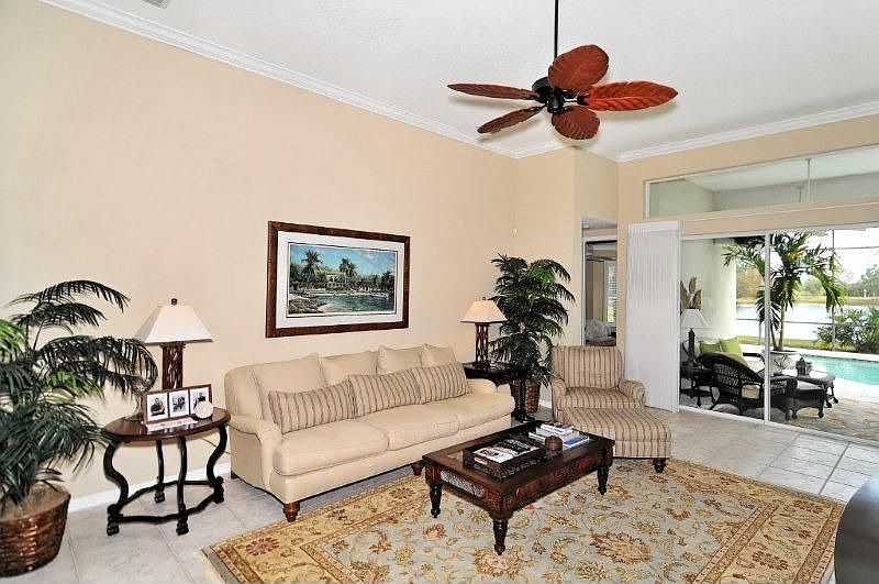 Beautifully maintained home, in desirable maintenance free neighborhood of Sandhills. Popular Neal Burgundy floorplan offering three bedrooms plus den and two bathrooms. Upgraded with crown molding, surround sound speakers, tile throughout living areas, high ceilings, quality fans & light fixtures. Kitchen has 42" cabinets, stainless steel refrigerator, gas range, under cabinet lighting and Corian countertops. Plantation shutters. Own gas heated pool & spa. Good sized lanai overlooking lake. 2 car garage with storage space. Community pool and spa too! Furniture available under separate agreement.