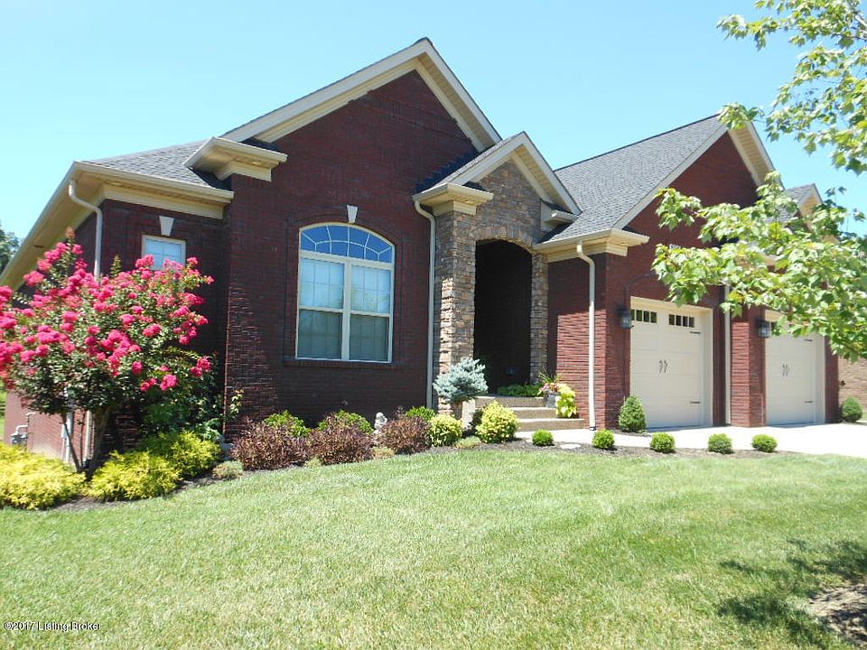 Beautiful 1 story walkout all brick and stone! This home features 4 bedroom, 3 bath and a large 2 car garage. Enter a barrel vaulted foyer to an open great room with rounded arched entryways! Detailed cabinetry in the eat-in kitchen with center island and granite tops is open to the dining area and Great room. From the great room access the deck with stone fireplace. The master has a vaulted hip tray ceiling with crown molding that adjoins a master bath with a huge custom tiled shower! The lower level is very nice with family room, counter space for a wet bar or kitchen and a full bath making it great as a guest suite or separate space for family. It can accessed from the long sidewalk around the house for private entry or through the main level. The unfinished portion in the lower level is framed for future expansion. Also on the lower level is a storage garage with double doors for lawn equipment. Nicely landscaped with irrigation system!
