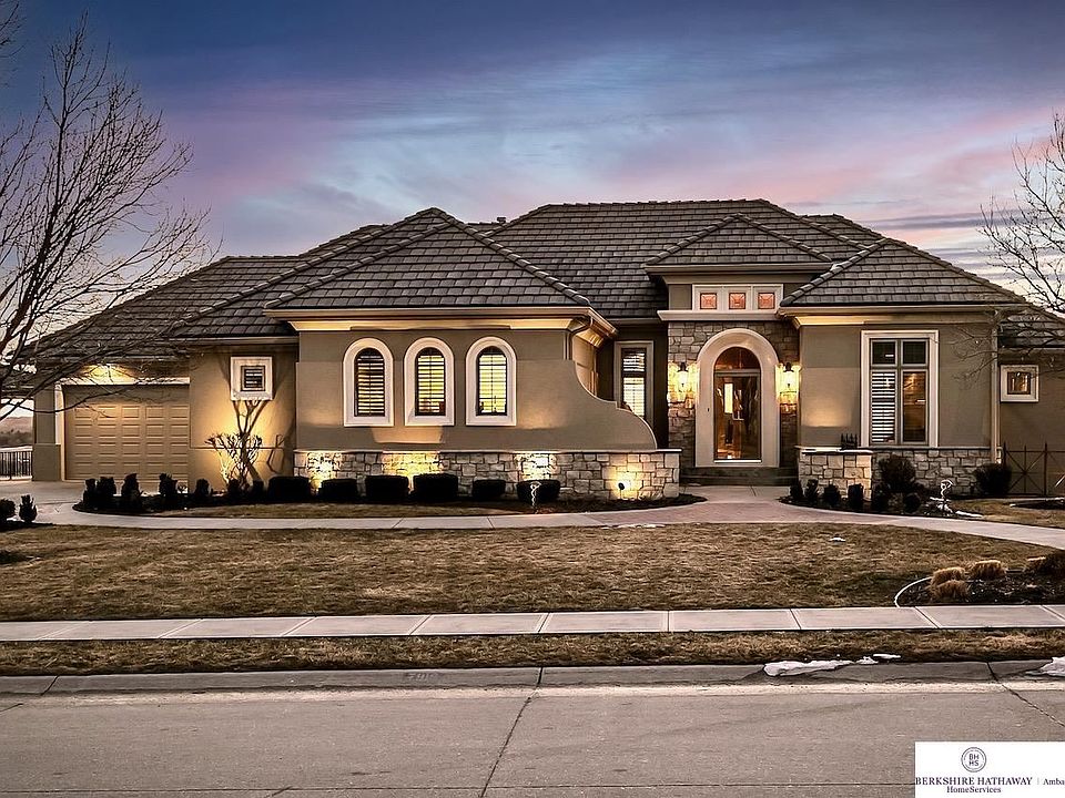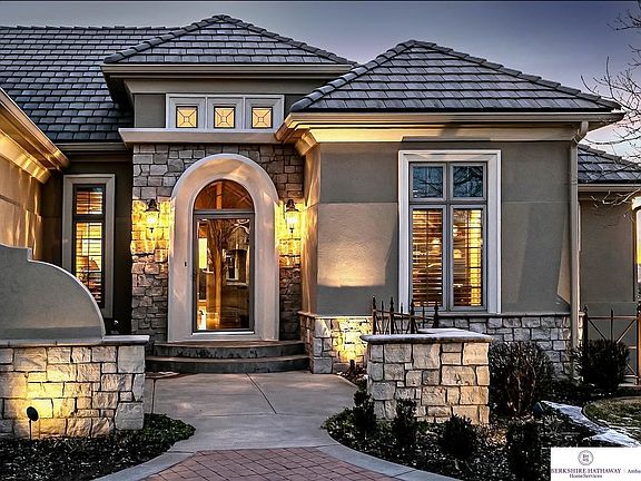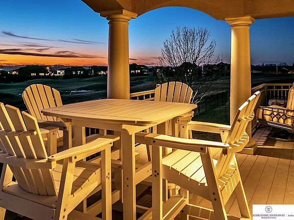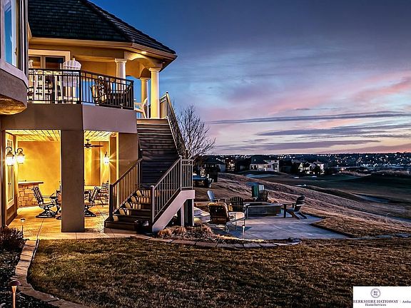 OPEN SUNDAY 02/13/22 1:00 - 3:00 PM. THE BEST SUNSET IN OMAHA & a breath-taking view! Overlooking the 6th hole of The Player's Club golf course, this 2005 Curt Hofer built Street of Dreams home features attention to detail in every corner. No penny spared in this 4 bedroom, 4-car garage walkout ranch in prestigious Deer Creek Highlands complete w/ a lifetime slate roof & full exterior finish around entire home. Features include custom inset cabinetry, gorgeous kitchen w/ Wolf appliances & huge center island. Soaring windows, automatic blinds & floor to ceiling limestone fireplace. Plus bonus "sunroom" w/ fireplace, primary bedroom w/ huge master bath, marble heated floors & steam shower. Entertain in your lower level bar & outdoor patio complete w/ trayed ceiling, built-in grill, wet bar, & huge firepit. 2 additional LL bedrooms & exercise room. Enjoy watching the golfers by day, sunset evenings, & starry skies around the firepit at night. A true oasis! Agent is related to the seller.