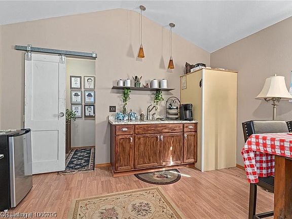 350+/- SF Garden Home/Shed on 2.26+/- acres w/complete living quarters, full bath. Sliding barn doors, between living room and closet/bathroom area, bathroom has safety grab bar, sitting area in shower, window blinds, pub table and chairs, microwave, refrigerator, large free standing cabinet, bunk beds, ceiling fan, All Electric. 30x60 fenced garden area. 3 pecan trees, 2 apple trees, 2 peach trees & banana trees. Great Location, Great Investment for Rental or Airbnb or Great spot for a golfer to practice swing. Or live here while you build. Gated & fenced on two sides. Wildlife to entertain you-Deer, Birds, etc. Watch the sunrise and /or sunset, enjoy gardening and outdoors, just minutes away from FS & Grwd. Easy access to I-49 & US 71.