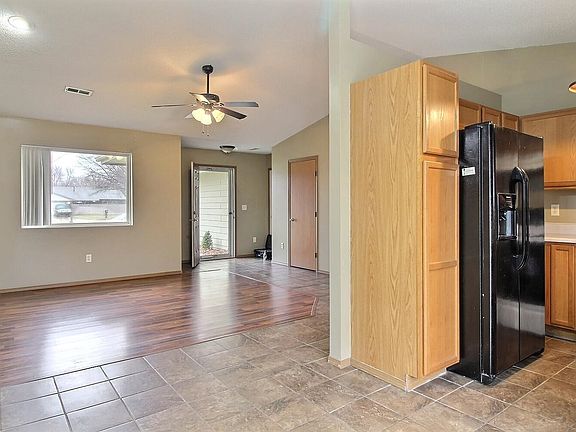 Well maintained slab home! Hard to find in North West Wichita, with zero entry under $200,000! Upon entering, you are greeted by a gas fireplace with a warm wood mantle, tile and wood flooring, and an eat in kitchen. The natural light with the open concept welcomes you home! You will find a double closet master with direct access to the bathroom. Additionally, there are two more bedrooms and a laundry room. Outside, you will find a fenced in backyard with a concrete patio - perfect for having friends and family over! Brand new roof being installed by Eaton Roofing in the next few weeks. New A/C capacitor 2019, New garage door 2020, New patio door 2019, New water heater 2018, new refrigerator 2018.