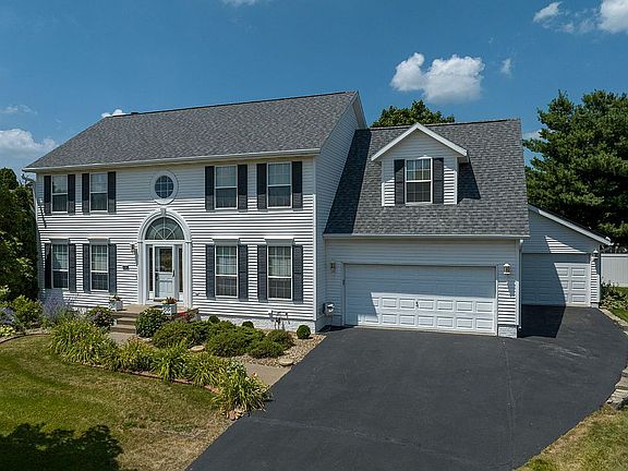 Don't let this well maintained home in the family-friendly neighborhood of Fox Trail get away. Call us any time for a tour and offers via buyers' agents may be considered. The entry of this home opens to a stunning two story foyer with solid oak floors that flow throughout the living, dining, and family rooms, as well as the kitchen and sunroom. The updated kitchen features a new refrigerator, granite counters, tiled backsplash, stainless steel appliances, a pantry, and a breakfast bar adjacent to the sunroom. All appliances stay with the home. The large primary suite features a mammoth walk-in closet, a separate sitting/dressing/office area, a bath with double sinks, an oversized tub and a private toilet and shower area. Three additional bedrooms with large closets and another full bath with dual sinks are included on the upper level. The lower level features a large open space with dance studio flooring and mirrored closet doors that may also be used as a workout area. Also in the lower level are finished areas that may be utilized for entertaining, crafts, or storage, a 1/2 bath, an additional pantry, and a corner outfitted with oak cabinetry including a utility sink and a small refrigerator. The backyard oasis features a 497 SF composite deck with a screened 12x12 gazebo overlooking the beautiful landscaping, vinyl privacy fence, stone fire pit, mature trees and perennials. You will also enjoy the relaxing Jacuzzi spa, multiple raised gardens, a matching shed, and automatic lawn irrigation. The 950 SF 3 car garage includes a large workshop, multiple built-in shelves and storage areas.