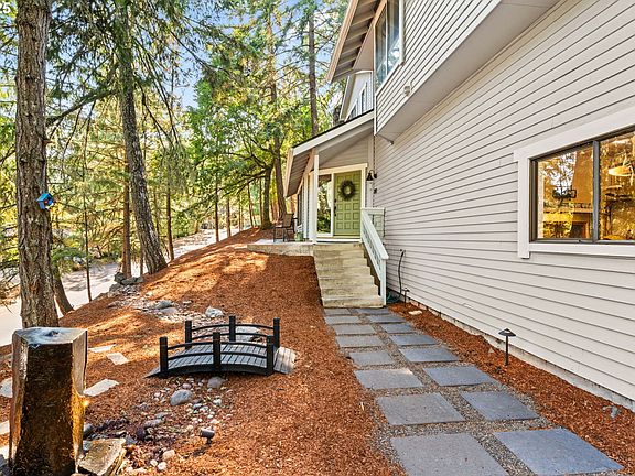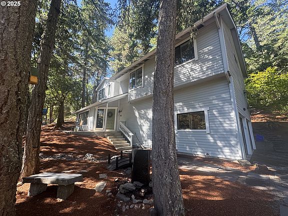 Tucked into the trees of Southeast Eugene, this updated home beautifully blends modern design with the peaceful feel of nature. From the moment you arrive, you’ll notice thoughtful touches—like the welcoming front entry with stone path and water feature—that set the tone for this inviting property. Inside, the home is light-filled and stylish, featuring vaulted ceilings, fresh finishes, and an open-concept layout perfect for both entertaining and everyday living. The living room’s large windows bring the outdoors in, while the modern kitchen boasts sleek countertops, stainless appliances, and clean white cabinetry. Retreat to the spacious primary suite with its own private bath, walk-in closet, and a tucked-away desk area framed by windows overlooking the trees. Additional bedrooms are well-sized with fresh paint and fixtures.Need flexible space? This home has it covered—with a cozy den accented by wood panel detailing and a huge garage with high ceilings, a workshop area, and storage galore. Step outside onto the elevated deck to enjoy your morning coffee among the trees, or gather in the landscaped front yard where stone paths, a water feature, and seating areas create a serene outdoor escape.