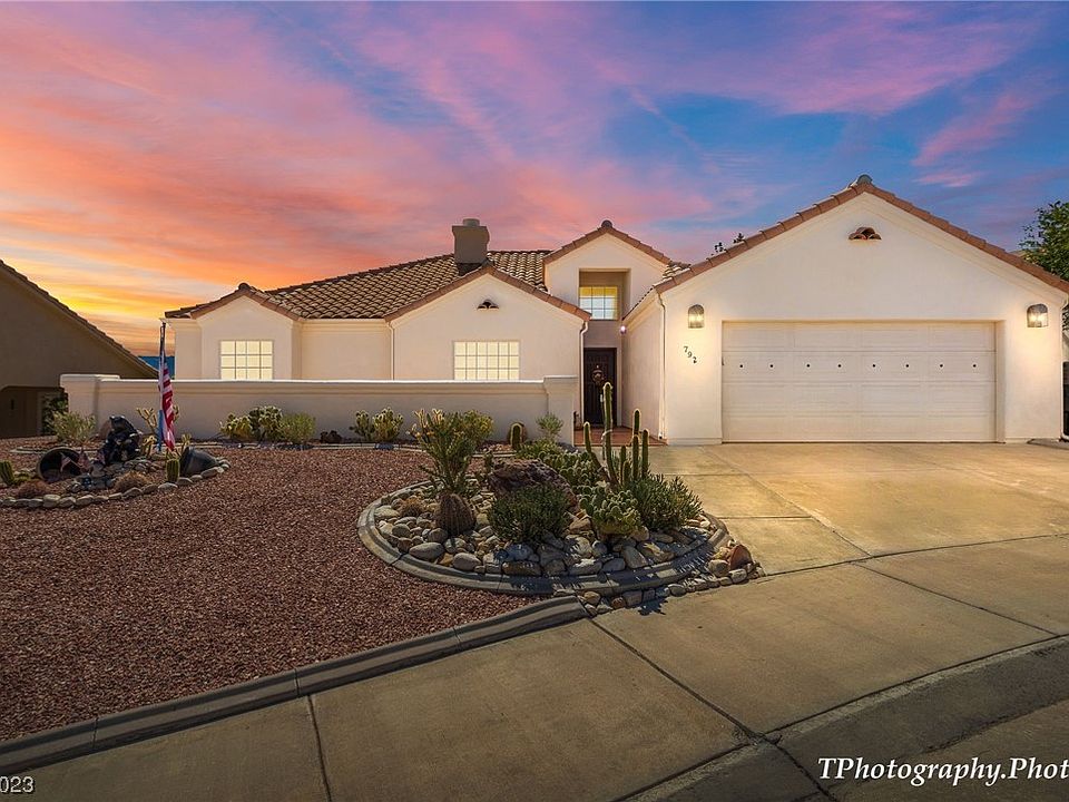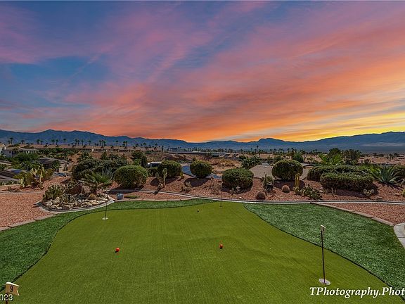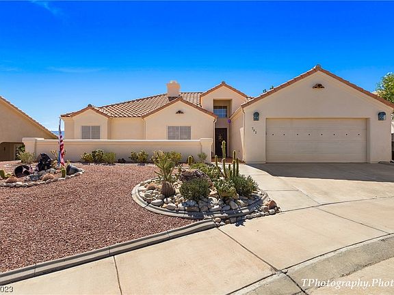 NO HOA FEES ON AN ELEVATED VIEW LOT! This 1808SF home offers a living room, dining area, kitchen, 3 bedrooms, 2 full bathrooms & a mud room. Plus, vaulted ceilings, ceiling fans, 2 walk-in closets, a fireplace, window coverings, Tile/carpet flooring, all kitchen appliances, washer, dryer, water softener & 2 by 6 construction. The living room, kitchen and dining room are in an open setting that is perfect for entertaining. The multiple French doors open up to the outdoors where you will find stunning views of the mountains, city and valley, a water feature, a covered patio, a putting green and a Tiki area on the side. The main bathroom has a shower/tub combo, and dual sinks. Most of the appliances, water heater, softener and A/C unit have been replaced in the last 3 years. The exterior has been re-painted with 2 coats. The desert landscaping in the front and backyard is low maintenance. The backyard faces South. You will find a painted floor in the 2-car garage along with cabinets.