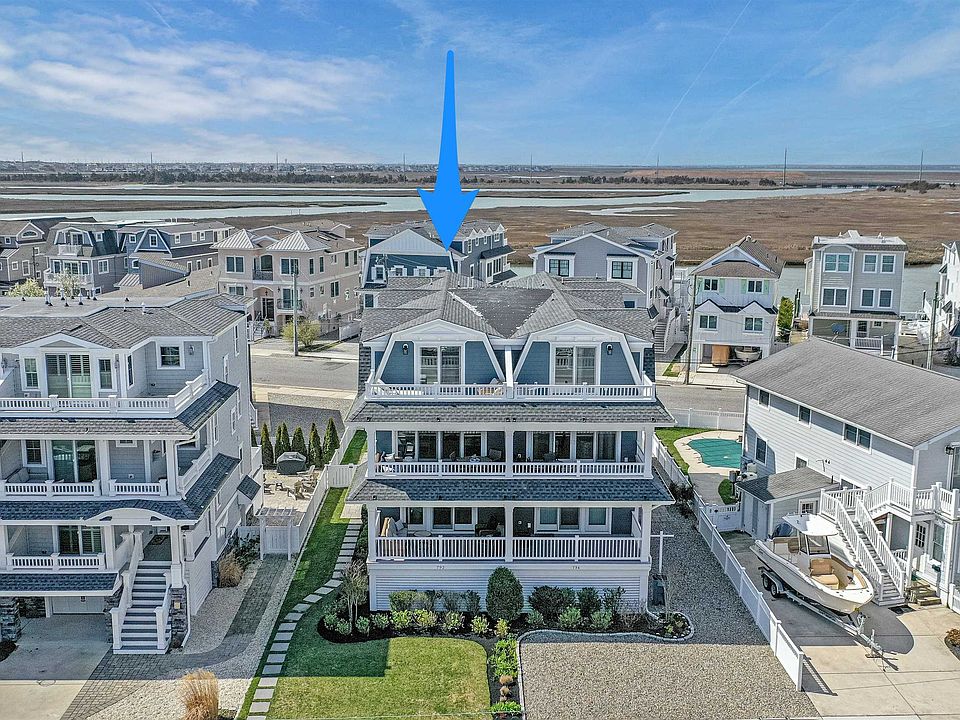 This sprawling, townhome property offers a one-of-kind combination of scale, finish, view, privacy and storage. Uniquely situated on a lot that measures over 7,800 square feet and fronts both Sunrise Drive and 21st Street, this is one of the single largest townhome lots and one of the single largest townhomes (2,718 sq. ft.) on all of Seven Mile Island. The interior spaces in this 2017 built home are exquisitely finished, with a sophisticated yet causal beach decor. The first floor features two large bedrooms, one of which is a flex space currently used as a family room. This beautiful room has slider access to a covered deck and a built-in murphy bed that allows this space to effortlessly transform into a sixth bedroom. One of two laundry areas rounds out the first level. An expansive primary entertaining space that rivals some single family entertaining spaces can be found on the second floor. The 60’ of lot width and 141’ of lot depth is obvious in this extra wide townhome, where the living room, dining area and kitchen are all dedicated, individual spaces that are materially larger than those found in the other townhomes currently available for sale. The chef’s kitchen offers stainless steel appliances, quartzite countertops, custom cabinetry and a massive center island with seating for 5. The living room is centered on a gas fireplace, is gorgeously furnished, and offers beautiful bay views through a 12 foot wall of sliders. Through those sliders is a second, covered deck, large enough for both a dining area and a living area. The northern and western water views from this space are dramatic. The privacy of this space is enhanced by the fact that all of the decks on the homes on the north side of Sunrise Drive face the bay. The second floor also contains a bedroom with an en-suite bathroom. This space offers slider access to a southern facing deck that is the perfect place to watch the sun set after a long day down the beach. The third floor features three more bedrooms, two full bathrooms, and a second laundry area. The Sunrise Drive facing primary suite offers slider access to a third floor deck that features the best views in the home. The rear, third floor bedroom is large enough to house multiple bunk beds and an additional day bed, allowing this room to become a savior on holiday weekends. Downstairs, the grade level features a concrete floor that spans the length of the home. This allows for a full car garage and an additional storage area that could house everything that you need to enjoy bay and beach life in Avalon. The rear yard is over 50’ deep, creating another opportunity for an entertaining space that you would not be able to find on a typical townhome lot. This area is currently outfit with a pavered entertaining space, a landscaped, fenced-in area, and then a pavered parking area large enough for an entire family’s fleet of cars. If you are in search of an impeccably decorated, massive property that will allow multiple generations of your family to comfortably coexist, look no further than this extraordinary opportunity.