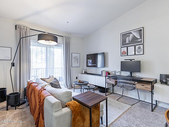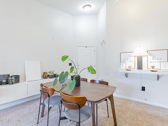 Discover a perfect blend of convenience and lifestyle in this lovely 2nd-floor condo with vaulted ceilings and a balcony. This 2-bed 2-bath split floor plan seamlessly combines the living & dining spaces leading into a kitchen equipped with all the essentials. Inside you will find a refrigerator, stove, dishwasher, microwave, washer, and dryer. Experience a sense of security with the community's gated entry & amenities including a refreshing pool with cabanas and playground. Minutes from Jacksonville International Airport, Town Center, JU and major roadways make this an ideal choice for both homebuyers and investors. Schedule a showing today!