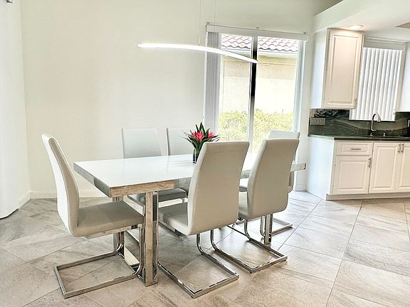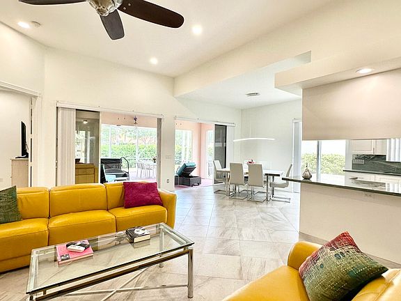 Truly an ''Exceptional'' property!! Step inside to discover a seamless blend of elegance and comfort with designer 20 x 20 tile extending throughout the main living areas and third bedroom, new laminate flooring in the principal and second bedroom. 12 ft ceilings in the Great Room and 10 ft elsewhere. The remodeled kitchen is a chef's dream, new top of the line stainless appliances and gorgeous Quartzite ''Intermarie'' counters, perfect for culinary creations!This home offers an open floor plan where kitchen, living and dining areas all flow together, great for entertaining. The principal bedroom has a huge walk in closet plus a whole wall of closets and a double bathroom arrangement.. Both bathrooms have been totally renovated and are STUNNING! Designer tile, ''Rain'' showerheads, and seamless shower floor with no step-down. Totally unique and very chic! The outdoor space in this home is an absolute SANCTUARY! You willl feel like you've been transported to a South Beach getaway, with a screened and covered patio that has a 10ft ceiling, surrounded with a stamped concrete and turf garden it is an absolute haven offering a serene retreat to enjoy your morning coffee or unwind in the evenings in total privacy!