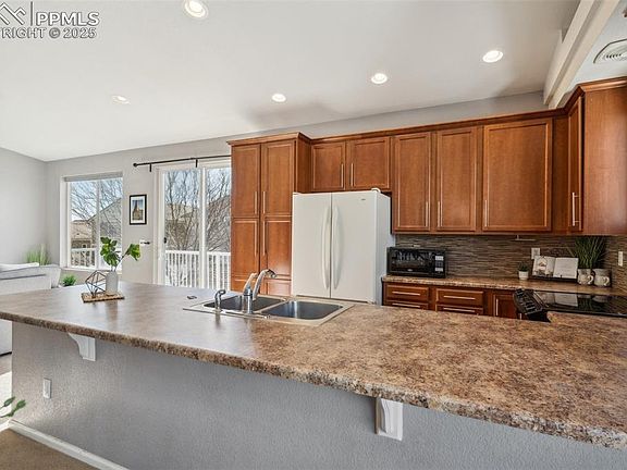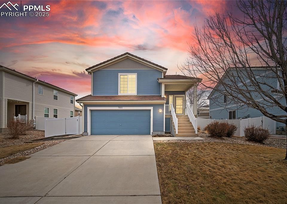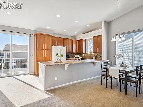 Modern bi-level home in the beautiful community of Cumberland Green. Enter a tiled foyer with wrought iron railings. The upper level has an open concept with a dining area, the kitchen featuring 42-inch cabinets, a counter bar, and a large pantry, and a spacious, walk-out great room with a gas fireplace and mountain views. A spacious owner’s retreat offers a large walk-in closet with built-in shelves and drawers while the adjoining bath includes a tiled, oversized shower and dual vanity. Immediately downstairs is a family room with a walk-out to the patio, both uncovered and covered, to enjoy Colorado’s beauty. Also on the lower level are two secondary bedrooms, a full bath, and a laundry room with loads of under stair storage. Additional features include Pikes Peak and mountain views, a tile roof, a fully fenced back yard with an 10x8 storage shed, and an oversized garage with one extra deep 24-ft bay. A short jaunt away from multiple neighborhood parks with the options to walk, play on a playground, participate in a round of disc golf. Conveniently located near the Powers corridor for shopping, dining, and entertainment. You won’t want to miss this one!