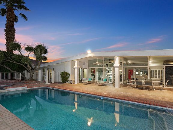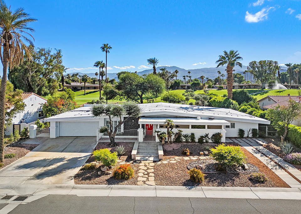 Your perfect seasonal escape awaits in this stunning mid-century modern home on the golf course at Bermuda Dunes Country Club. Built in 1960 and lovingly updated, it features 3 bedrooms and 3 baths in the main home, plus a fully remodeled detached casita for visiting friends or family. Enter into this original model home in Bermuda Dunes CC and notice the high beam ceilings, and ''floor to ceiling'' glass across the entire living/dining room showcasing the Santa Rosa mountains and the #2 Fairway of Classic 1. The living room features a Stone fireplace for those cool winter nights. The kitchen has all the most updated S/S appliances featuring double ovens, two dishwashers for loadsof entertaining, wine refrigerator and a coffee bar and pantry area. Primary bedroom is spacious with door leading to the pool/spa. Ensuite bathroom has dual vanities and a large updated shower. The Ensuite guest bedroom is also spacious. Third bedroom is currently used as a den. The casita/guest house is amazing! With a King size murphy bed, kitchenette with induction cooktop, refrigerator & small dishwasher. New Flooring, Shower, Vanity and Toilet were also updated. Outdoors, you'll find a large grassy yard ideal for pets and playtime, a sparkling pool and spa, and breathtaking southern mountain and golf course views. Back patio has a Patio bar with a misting system across the entire back side of the house. Two car garage has a 220 charger for your electric vehicle and epoxy coated floor. Designed for comfort and effortless living, this property offers resort-style relaxation, privacy, and a dog lover's back yard -- the ultimate Palm Springs area retreat.