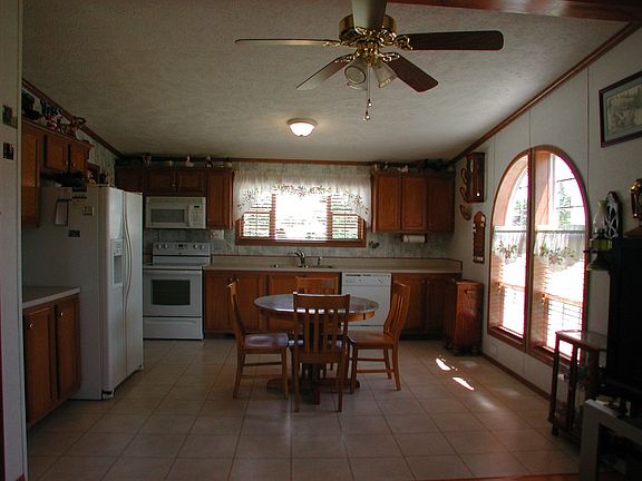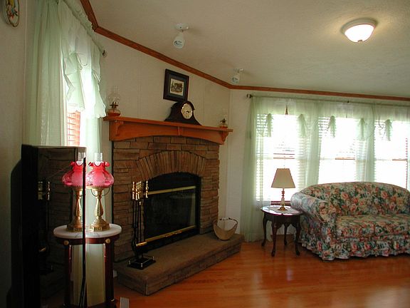 In ground storm cellar put in place 2 years ago. Home is on permanent foundation with crawlspace. House has a fireplace with gaslogs, the appliances stay.Two car garage that is and has heating and cooling. Two outbuildings on peoperty 8x8 and 8x10. Nice landscaping, andthere is a blacktop driveway.