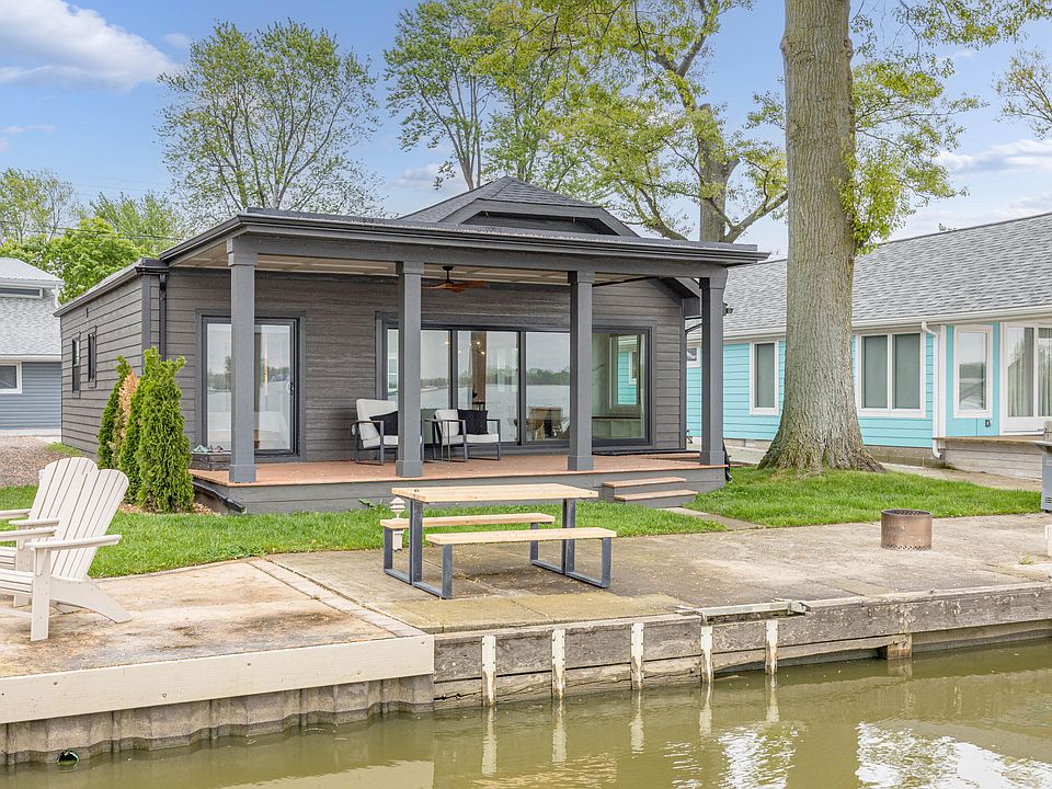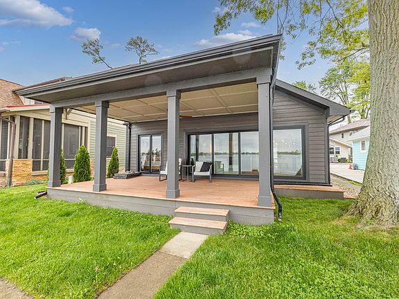 Modern lakefront luxury meets timeless tranquility in this beautiful, fully renovated getaway nestled along the shoreline. With bold curb appeal, this dark-toned exterior is both sleek and inviting, leading into a home that radiates contemporary elegance and panoramic water views from nearly every room. A wonderful, covered deck with ceiling fan invites you to enjoy summer evenings in comfort, while floor-to-ceiling sliding glass doors seamlessly blend indoor and outdoor living—offering uninterrupted views of the sparkling lake just steps away.