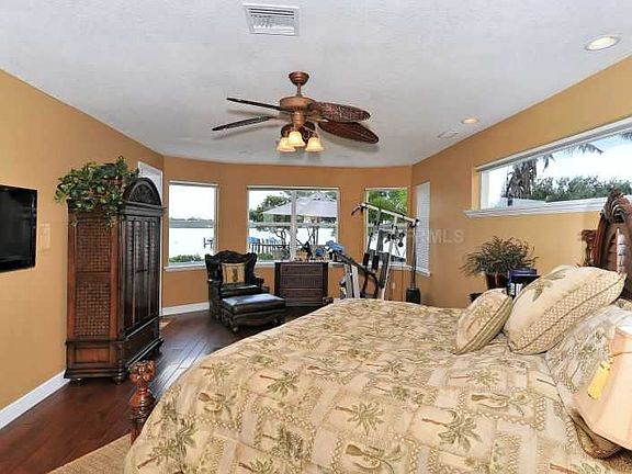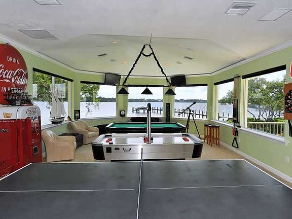 This property has all the essentials for a good time including: dock with lift, 2 jet ski lifts, private beach on the bay, deeded beach easement directly across street, Swiss Family Robinson Tree House for adults and kids, professional audio and visual system that includes 12 Zones and 26 high quality speakers with 8 flat screen televisions and a movie theater. The home has a fantastic floor plan with a kitchen/family room combination, giant bonus room with windows galore, office with hardwood floors, separate dining room, master bedroom on main floor with 3 additional bedrooms and 4 full baths. The family, master bedroom, and bonus room have direct views of the disappearing negative edge pool and the Intra-Coastal. The home sits on 1.5 lots so you could easily add on living space or more garages. The property Is 176 feet wide which is very unusual along with acres of submerged land. This home demands a new owner to continue the Good Times! Seller being transferred out of state. Very Motivated!!!!